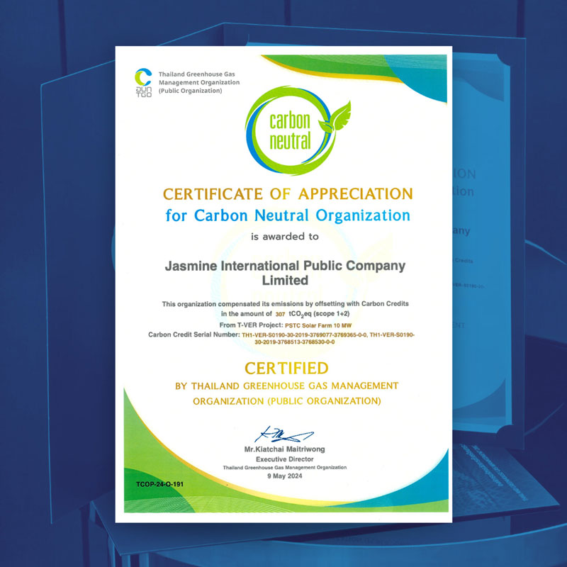 Dr. Karl Jamornmarn, the Chairman of Audit and Corporate Governance Committee, Jasmine International Public Company Limited (JAS), received Carbon Footprint for Organization (CFO) Certificate and Carbon Neutrality Certificate from Thailand Greenhouse Gas Management Organization (Public Organization: TGO), presented by Mr. Pongpanu Svetarundra, for the second consecutive year. The event was held at TGO Training Room.